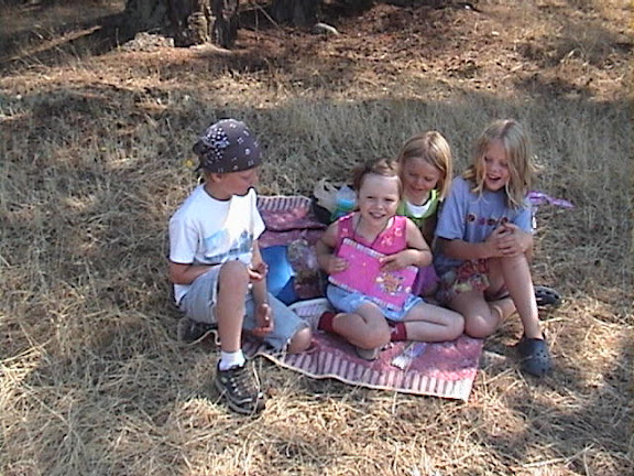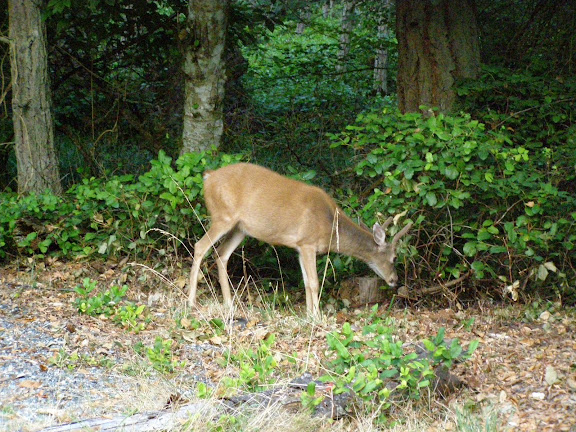 It sure is nice being at the dock when you have kids.  The kids had so much fun fishing from the dock and later swimming.  The dock was full of other kids, as well, so they all had a great time together.  After dinner we decided to take a walk to the schoolhouse so the kids could get some energy out.  We were sitting by the swings when we heard some rustling in the trees.  Pretty soon a deer came running out of the woods and stopped: