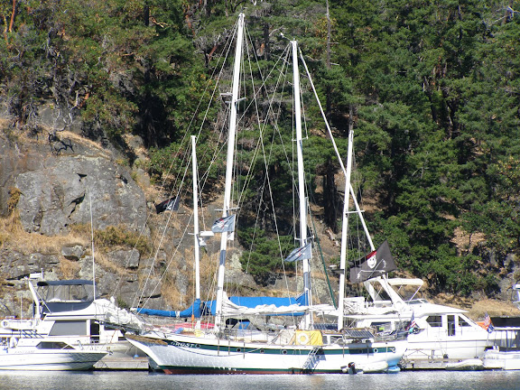 We headed out of Sidney Spit pretty early and headed to Roche Harbor.  It was a pretty uneventful trip and we arrived into Roche around 8:30 a.m.  After clearing customs we anchored Ghost out in the harbor.  We headed to town to get some food for a dinner party we were having aboard Ghost that night.  We had invited our friends Darren and Lisa over for dinner.  After getting back to Ghost we received a call from our friends Bob, Shari, Sydney, Annie & Tabor on Pearl and they were headed into Roche Harbor to meet us.  Excellent, the dinner party had just grown a bit.  As we were waiting for Pearl to show up we saw a boat come in with a Lats and Atts Burgee flying, so we introduced ourselves and told them to come on over later for some drinks aboard Ghost.  More to add to the party!  It ended up being a fabulous evening.  We even made some new friends, Greg & Brenda.