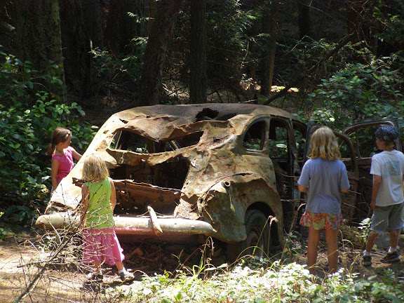 And then he took off running again.  It was like he just stopped so we could take a picture.  We headed back to the boat and went to bed.  The next morning we decided to take a hike to the lighthouse.  The kids did great!  On the way they always make up stories about the old car along the way:
