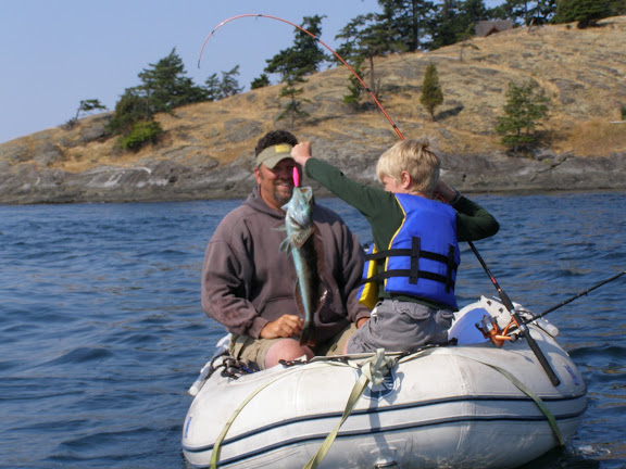 The next morning we decided to go fishing.  The four of us headed out in the dinghy and met up with CB, who wanted to go, as well.  We didn't catch much, but still had fun.  Zak caught his first lingcod: