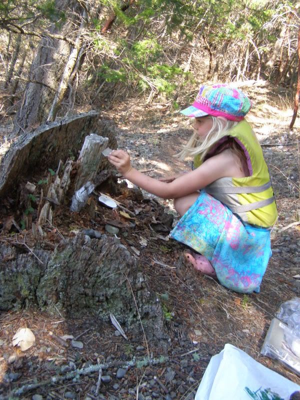 The boys caught 4 greenlings, so we grilled those up and combined food for another great dock party. We spent the evening hanging out in Palarran's cockpit. They took off the next morning, but Angelique stayed for another night. While taking a walk the day before with Fathom, the kids found a perfect place for another Fairy House, so the next morning, we gathered some special items to help create it and headed out for a Fairy House building expedition.