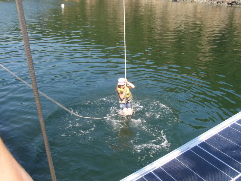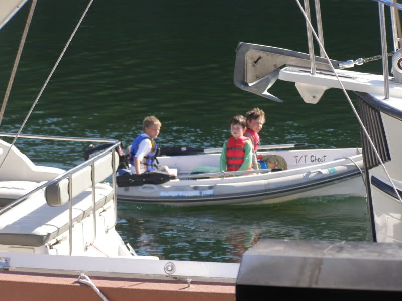 They always have a blast with the boom swings. While I was gone another boat came to the dock with a boy around Zak's age, Kyle. They bonded and started kayaking, driving the dinghy, playing games, and swimming. After Ruth and I returned, we had a big social time on the dock with the other boats. The crew of Serenity, Bill and Karen were wonderful and provided all the kids (and adults) with smores, yummmm! Our neighbors, Frank and Chanda, showed up on Midnight Blue and came over to the dock to chat and see Fathom: