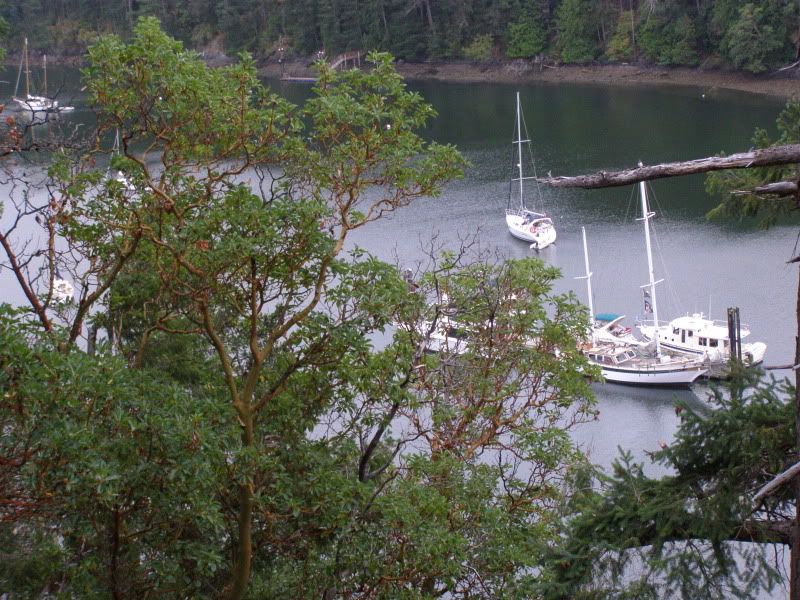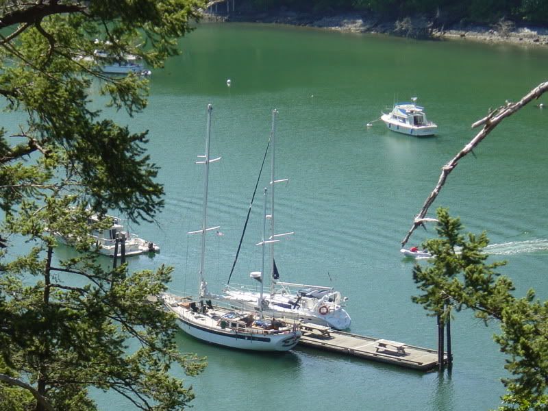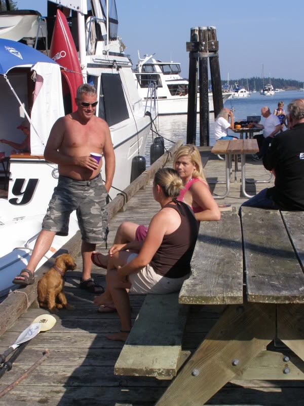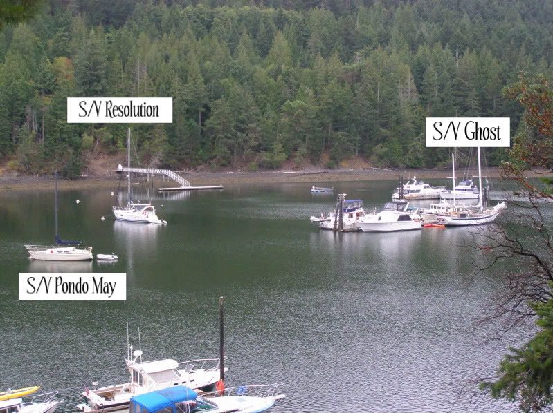 Unfortunately, this ended up being such a busy couple days, we weren't able to sit down and catch up with them. After that some people I know from work showed up on the dock and were suprised I knew their address. It's terrible when you know people by a number instead of their name. Then out of nowhere a dinghy comes up and the people start waving and out of the corner of my mouth I ask Scott "do we know them?" He shrugs, "I don't know". Come to find out it's our friend Bob"s (Bob & Shari from S/V Pearl) cousin, Steve and his new wife Kathy, who bought Scott's first boat the Pondo May from Bob & Shari. Then it dawned on us that they had to get to Reid Harbor aboard the Pondo May. So it was actually in the harbor. The boat that started it all. The boat we were on when we first pulled into Reid Harbor, introducing us to the San Juan Islands. They told us they were going to pull in closer and ended up taking the other buoy that was closest to the dock:
