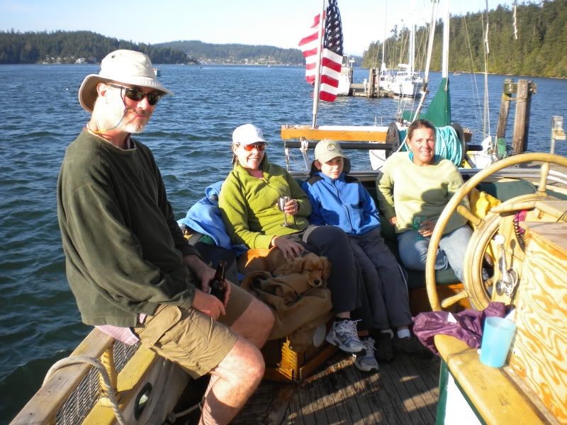 It was another great evening at Reid Harbor. The next morning Angelique headed out to Friday Harbor. We were waiting for our friends, Bob, Ingrid, Roscoe, and Skye to show up aboard their new boat, Adiamo. It was another beautiful day in the San Juans and ended up being a crazy day of "blasts from the past." Scott and Ellie took Fathom for a hike and as I was walking up on deck a family was getting out of their dinghy. I did a double take, because I knew that I knew these people, but it didn't fit. The last time I had seen these people was at the same dock, 8 years ago. They are friends of Jim and Debbie, who were aboard last week, and we had met up with them 8 years ago at the same dock in Reid Harbor, us in Ghost, and them in a charter boat named Resolution: