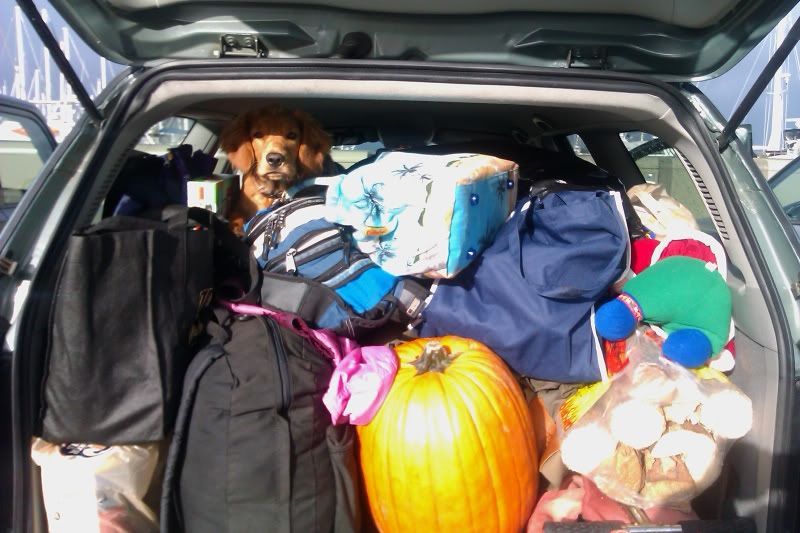 Anyway, October was a great month. We were quite busy with soccer season, but we planned a weekend away with our friends from Pearl, Bob, Shari, Sydney, Annie, and Salty. They invited us to join them on Orcas Island at some cabins called West Beach Resort. We were staying two nights and the car looked like we would be gone a week: