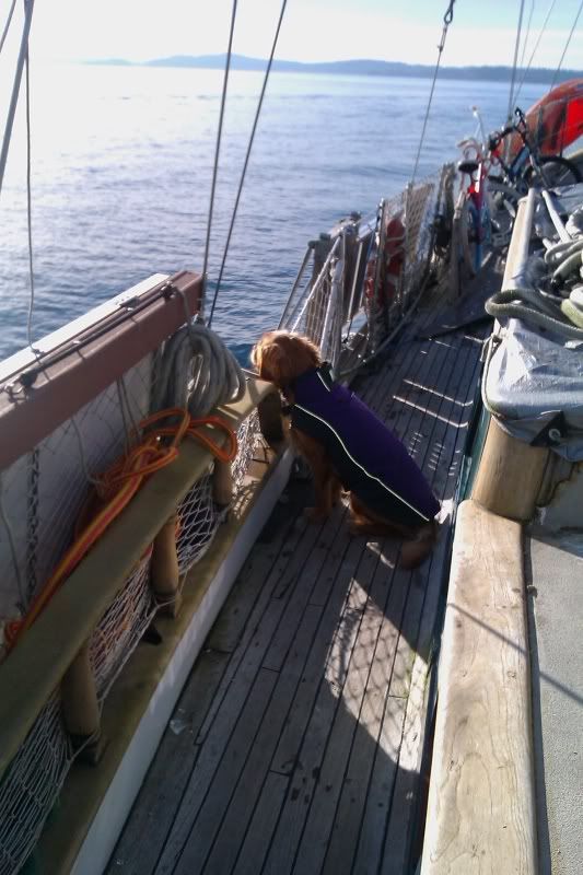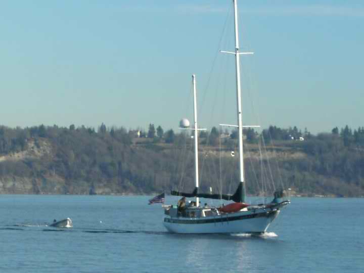 We decided to spend New Year's Eve in Blakely Harbor this year with our friends from Hawkwind. The weather was absolutely beautiful. Extremely cold, but beautiful. We headed out together and both took pictures of each other. Fathom seemed to be happy to be out on the boat again: